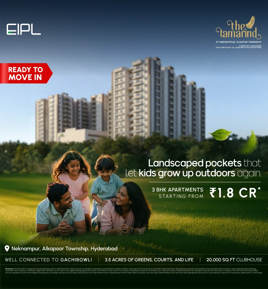 All information, images and visuals, designs and drawings, plans or sketches are only representative, an architect’s impression or artistic renderings and not to scale. Interior and Accessories shown in the Show Apartment are illustrative and indicative only. Areas and land outside the periphery/ boundary of the Project are indicative and no right is created thereon. Nothing contained herein intends to constitute a legal offer and does not form part of any legally binding agreement. Recipients/ viewers are advised to exercise their discretion in relying on the information provided and are requested to verify all the details, specifications, including common areas, landscapes, amenities and facilities, services, payment plans and other relevant terms independently with the Promoter, have thorough understanding of the same and take appropriate advice prior to concluding any decision for buying in the Project. Registration No.Coming Soon available at . For more information please visit - Project address - Hyderabad’s Financial District. Terms and conditions apply.